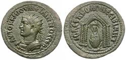 Reverse: IOV CЄΠ ΚΟΛΩ ΝЄCIBI MHT, Tyche facing, ram above, within tetrastyle temple