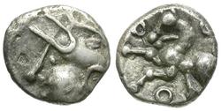 Obverse: Bizarre Celtic bust left with two pellets representing eyes and two pellets representing the nose and mouth