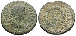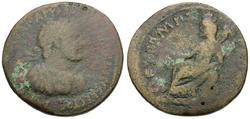 Reverse: ΠΕΤΡΑ ΜΗΤ ΡΟΠΟΛΙC, Tyche seated left on rock, extending hand and holding trophy