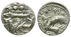 Obverse: Galley with lions-head figurehead left, two hoplites within, hippocamp left below