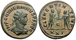 Reverse: CLEMENTIA TEMP, emperor standing right, holding scepter, receiving Victory on globe from Jupiter standing left, holding long scepter, Є between; XXI in exergue