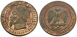 Obverse: NAPOLEON III LE MISERABLE / 80 000 PRISONNIERS, emperor wearing pointed German helmet, smoking a cigarette and chained to a collar inscribed SEDAN