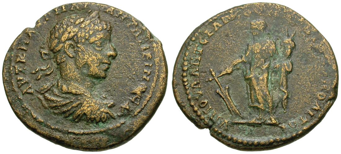 | Elagabalus (AD 218-222). Moesia Inferior. Marcianopolis. Julius Antonius Seleukus, consular legate Æ26 / Tyche |