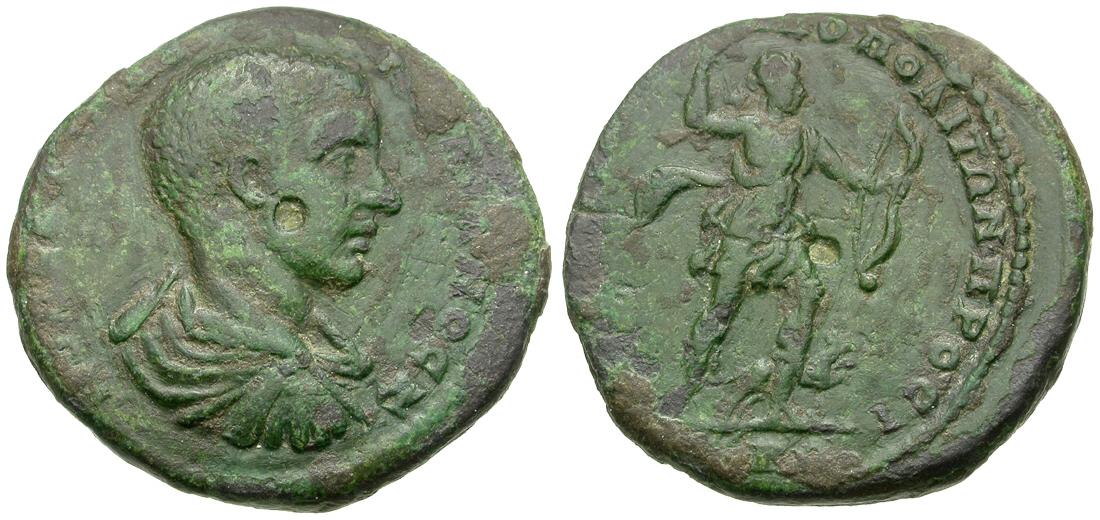 | Diadumenian, Caesar (AD 217-218). Moesia Inferior. Nicopolis ad Istrum. Statius Longinus, legatus consularis Æ27 / Artemis |