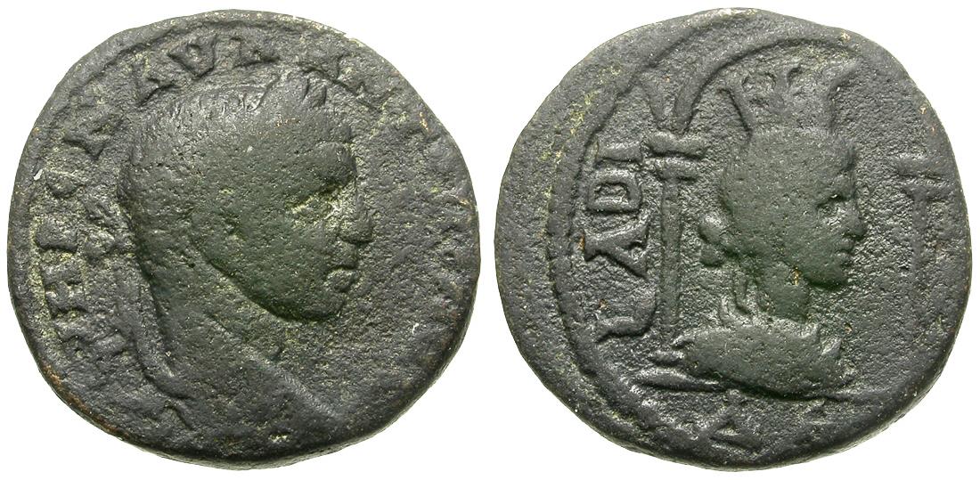 Reverse: LADI - [KEON] / ΔЄ, turreted draped bust of Tyche right, in distyle shrine
