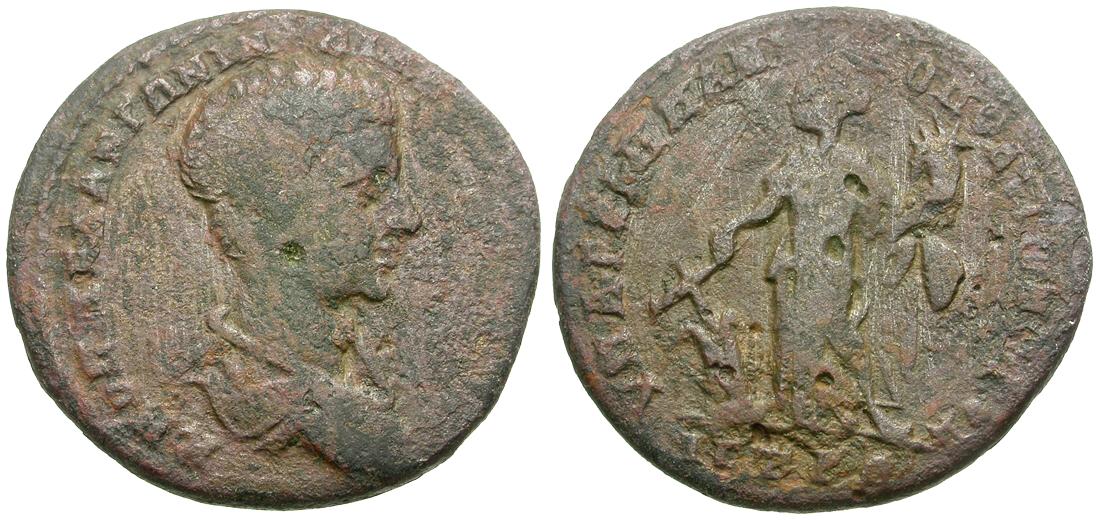 | Diadumenian, Caesar (AD 217-218). Moesia Inferior. Nicopolis ad Istrum Æ27 / Tyche |