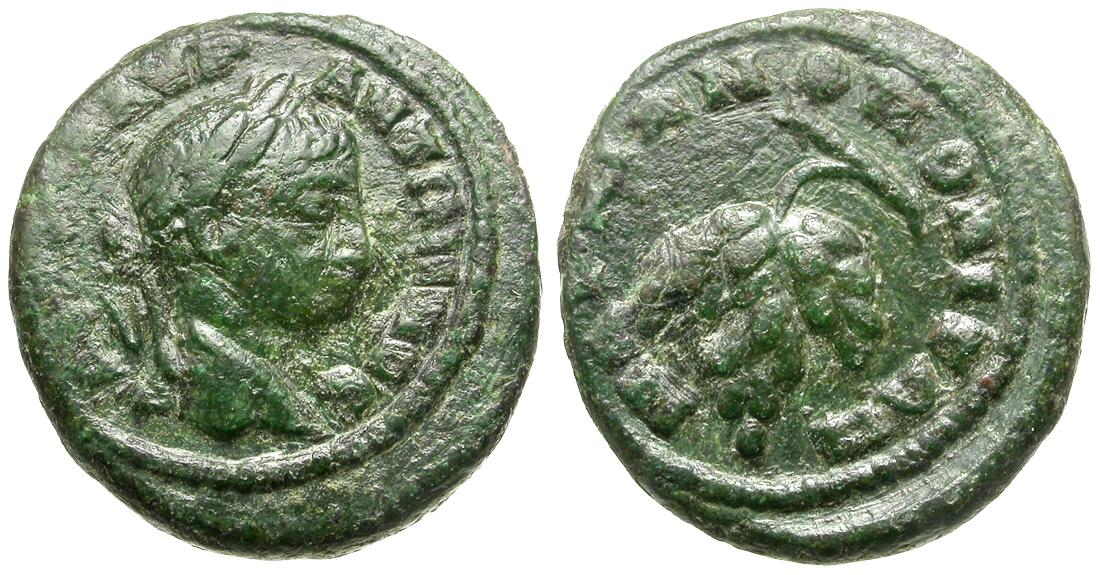 | Elagabalus (AD 218-222). Moesia. Markianopolis Æ16 / Grapes |