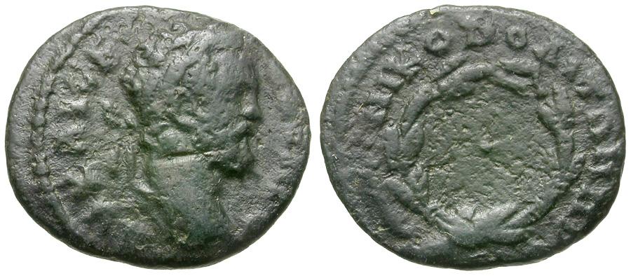 Attribution: Varbanov 2484 Date: AD 193-211 Obverse: Laureate head of Septimius right Reverse: Pellet within laurel wreath Size: 16.71mm Weight: 2.04 grams Rarity: 6 Description: good Fine. Rare.