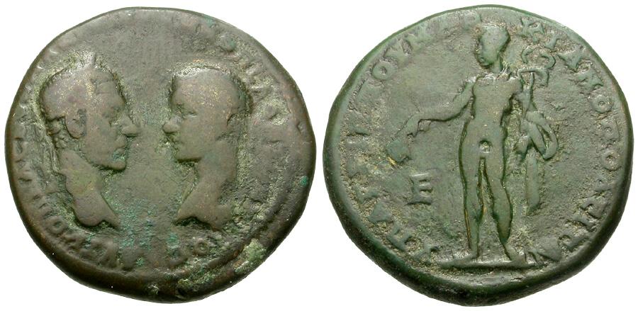 | Macrinus (AD 217-218) with Diadumenian. Moesia Inferior. Marcianopolis. Marcus Claudius Agrippa, consular legate Æ27 / Hermes |