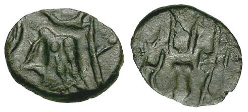 Obverse: Long-haired head left, crescent above, symbols to either side