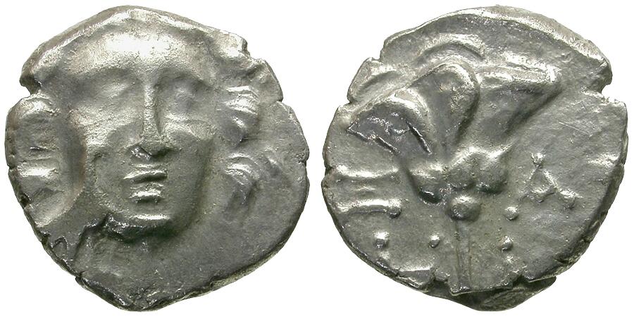 Obverse: Facing head of Helios, bird standing right in front of right cheek
