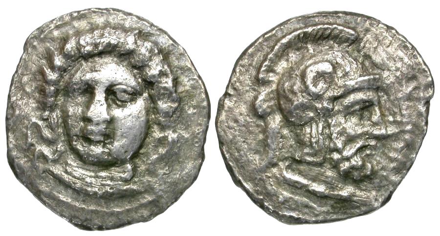 Reverse: Ares right wearing crested Corinthian-style helmet