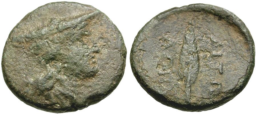 Obverse: Head of Atalanta (or Aetolia) right, wearing kausia