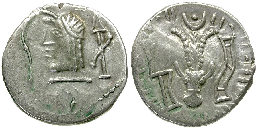 Reverse: Bucranium with antelope's horn and plumes