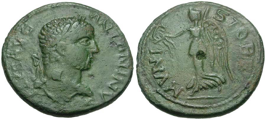 | Caracalla (AD 198-217). Macedonia. Stobi Æ23 / Nike |