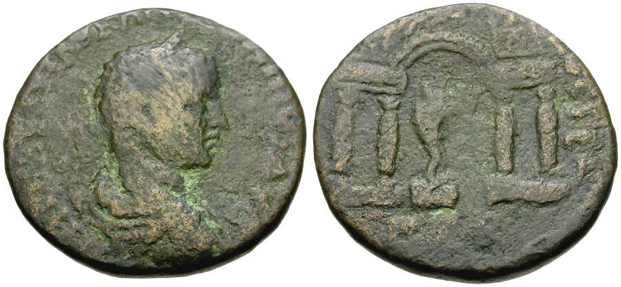 Reverse: The satyr Marsyas, playing pipes on pedestal within tetrastyle temple