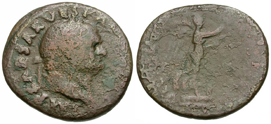 Reverse: VICTORIA NAVALIS, Victory standing right on prow, carrying wreath and palm branch; S-C across fields