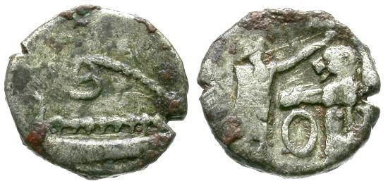 Reverse: Bearded deity about to slay lion, Phoenician letter O ('ayin) between them
