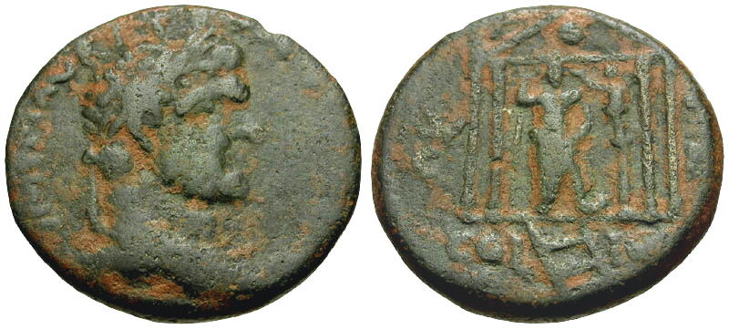 Reverse: Astarte standing facing, crowned by Nike on column in tetrastyle temple, COL-BER below