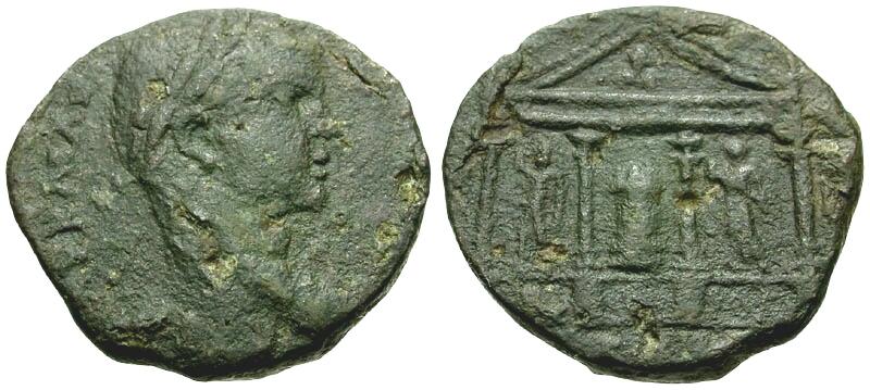 Reverse: TPI-ΠO-ΛI-TωN, tetrastyle temple of Zeus Hagios, containing flaming altar at center, statue of Helios to left, statue of Selene to right