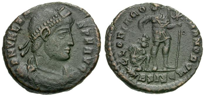 Obverse: DN VALEN-S P F AVG, pearl-diademed, draped and cuirassed bust right