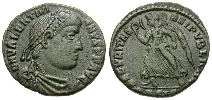 Obverse: DN VALENTINI-ANVS P F AVG, diademed and draped bust right