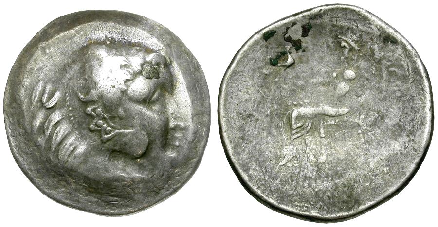 Obverse: Stylized head of Herakles right, in lion skin headdress
