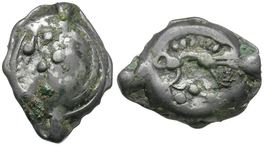 Obverse: Bizarre Celtic bust left with two pellets representing eyes and two pellets representing the mouth