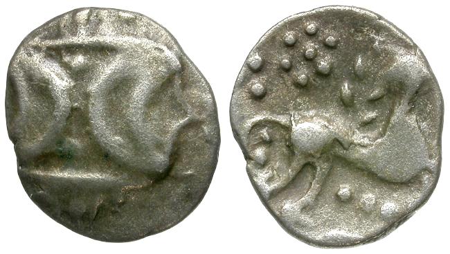 Obverse: Head right comprised of double crescents, pellets between, surrounded by lines of pellets