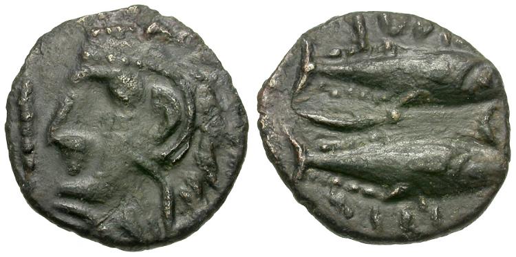 Reverse: Two tunny fish left, crescent and pellet between their heads