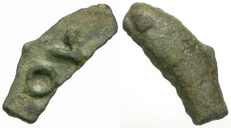 Obverse: Cast form of dolphin leaping left, with eye and dorsal fin