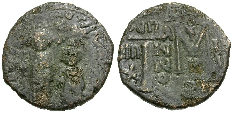 Obverse: Heraclius and Heraclius Constantine standing facing, each wearing crown and chlamys, and holding globus cruciger