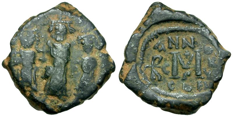 Obverse: Heraclius standing between Heraclius Constantine and Martina, all three crowned and holding globus cruciger