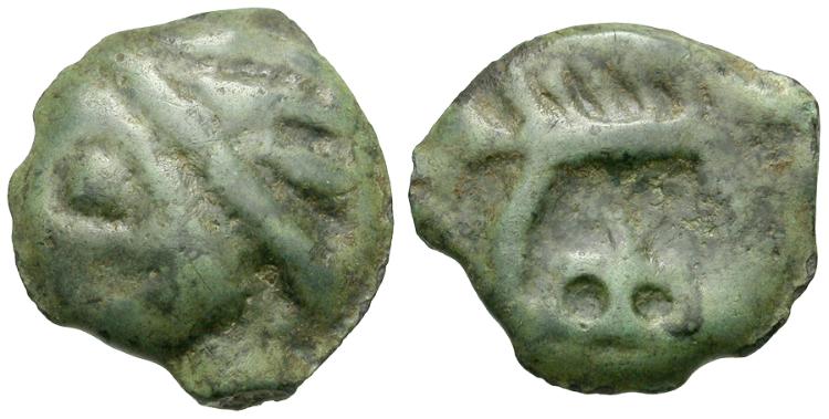 Obverse: Stylized head left with large eye, neck and three strands of hair