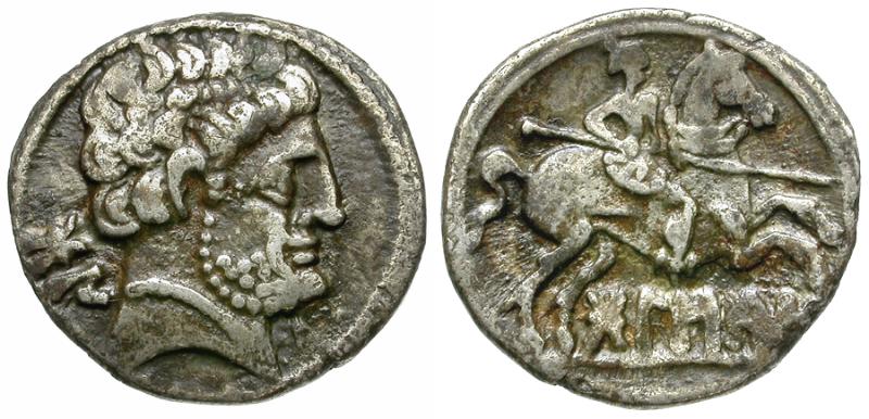 Reverse: Horseman galloping right with spear forward, Iberian legend below