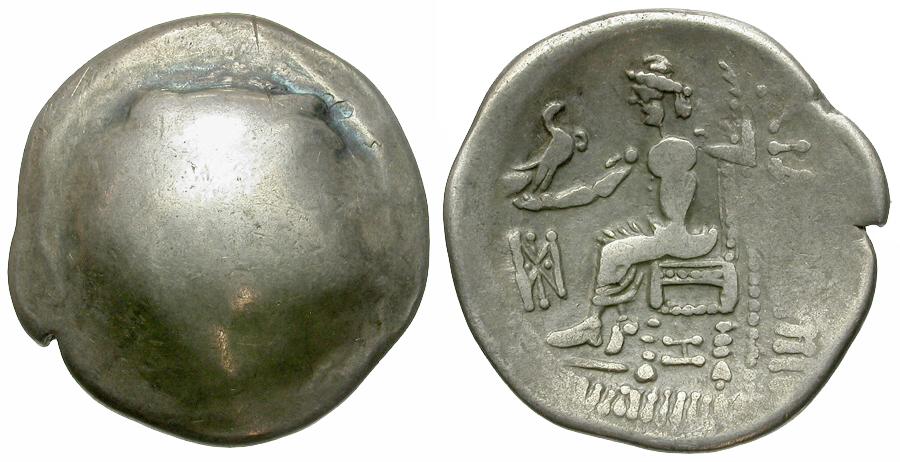 Reverse: ΦΙΛΙΠΠΟΥ / ΒΑΣΙΛΕΩΣ (blundered), Zeus enthroned left, holding eagle and scepter, monogram in left field, 𐤆 below throne