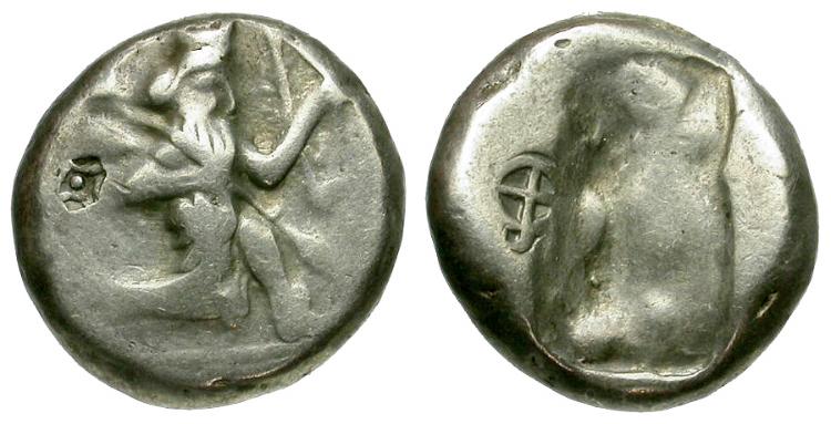 Obverse: Great King right, in a running or kneeling stance, holding bow and spear