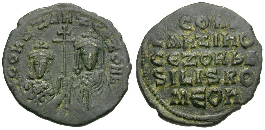 Obverse: ✠COnStAnt CЄ Zoh b, facing busts of Constantine on left and Zoe on right, holding long patriarchal cross between them