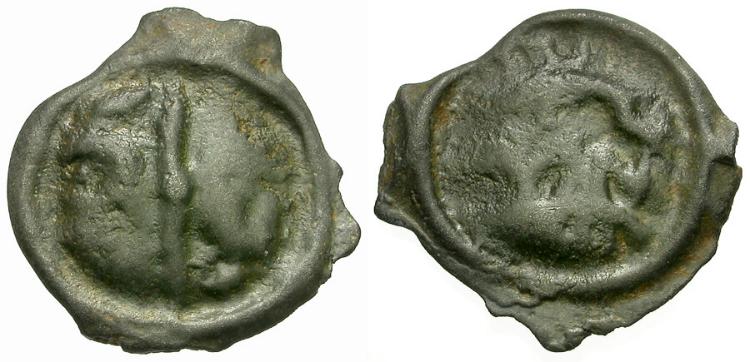 Description: VF. A nice potin with interesting stylized Janiform bust copied from Roman Republic coinage.