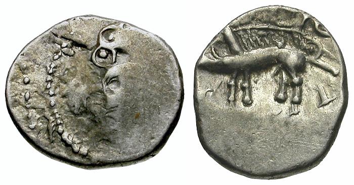 Description: AU-MS with scarcer boar reverse. Flat striking, double strike on obverse, an amazing mint state boar with original striking luster below and behind.