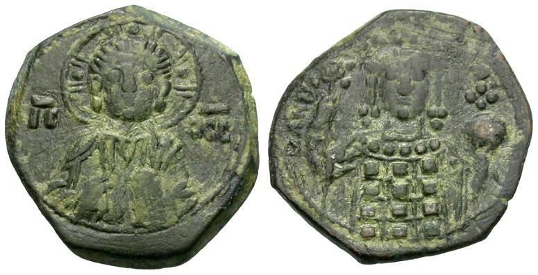 Reverse: Crowned facing bust of Manuel, holding labarum and globus cruciger