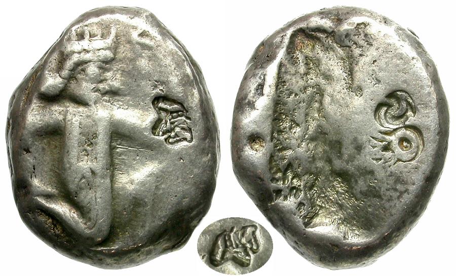 Obverse: Great King right, in a running or kneeling stance, holding bow and dagger