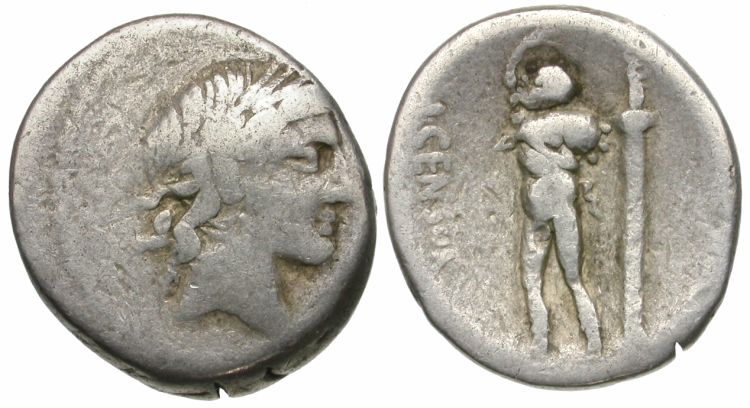 Reverse: L•CENSOR, satyr Marsyas standing left with right hand raised, holding wineskin over shoulder; statue of Athena on column behind him