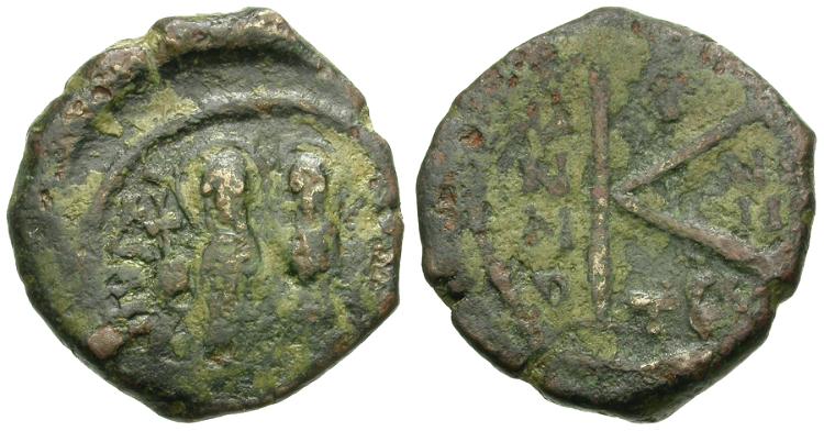 | *Sear 366* Byzantine Empire. Justin II (AD 565-578) with Sophia Æ Half Follis |