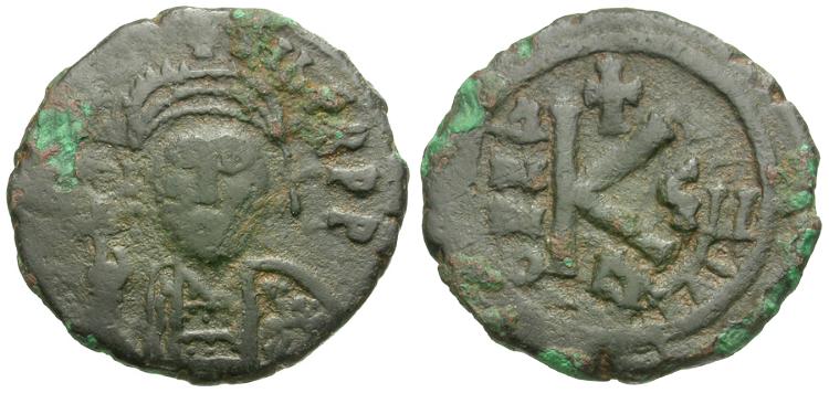 | *Sear 497* Byzantine Empire. Maurice Tiberius (AD 582-602) Æ Half Follis |