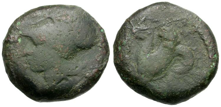 Attribution: SNG ANS 447 Date: 405-367 BC Obverse: Helmeted head of Athena left Reverse: Hippocamp left Size: 19.57mm Weight: 7.64 grams Rarity: 5 Description: good Fine