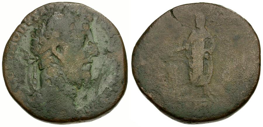 Reverse: [VOTA SVSCEPT DECEN P M TR P VIIII IMP VII], emperor standing left, sacrificing from patera over lighted tripod altar, S-C across fields; COS IIII P P in exergue