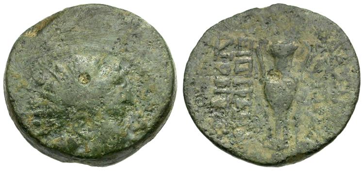Reverse: BAΣIΛEΩΣ ANTIOXOY / EΠIΦANOYΣ ΔIONYΣOY, kantharos, branch to right