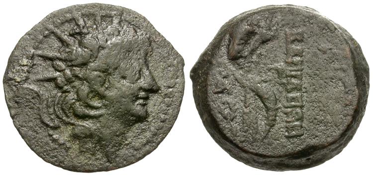 Reverse: ΒΑΣΙΛΕΩΣ ΑΛΕΞΑΝΔΡΟΥ, double cornucopia, tied together with fillet, A above wreath to left, Π to right