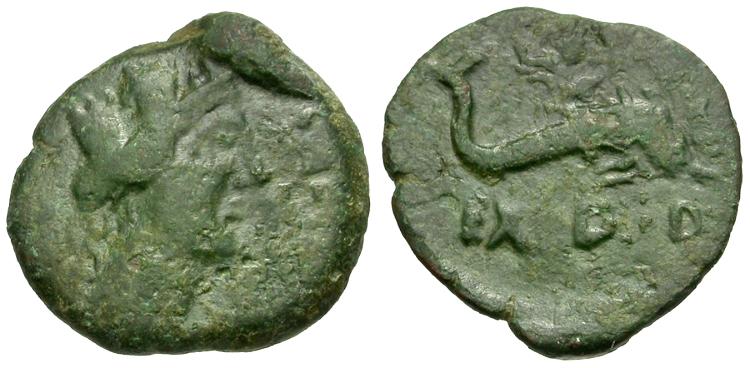 | Spain. Iberia. Carteia Æ Quadrans / Cupid Riding Dolphin |